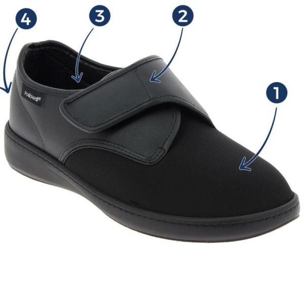 Cette chaussure de détente pour Homme ou Femme en cuir et textile est prévue pour un usage intérieur ou extérieur. Avec son avant-pied entièrement en élasthane elle donne la souplesse nécessaire en cas d’hallux-valgus ou d’orteils en griffe. Sa semelle intérieure est amovible et peut-être remplacée par une semelle sur mesure.