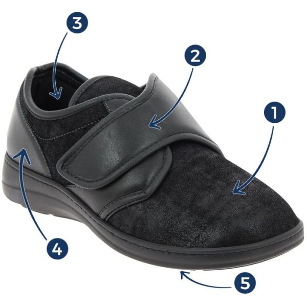 Cette chaussure de détente en cuir et textile est prévue pour un double usage : intérieur ou extérieur. Elle dispose d’un tour de cheville et d’un avant-pied très extensibles, qui offrent la souplesse nécessaire en cas d’oedème ou d’orteils en griffe. Sa semelle amovible peut-être remplacée par une semelle sur-mesure.