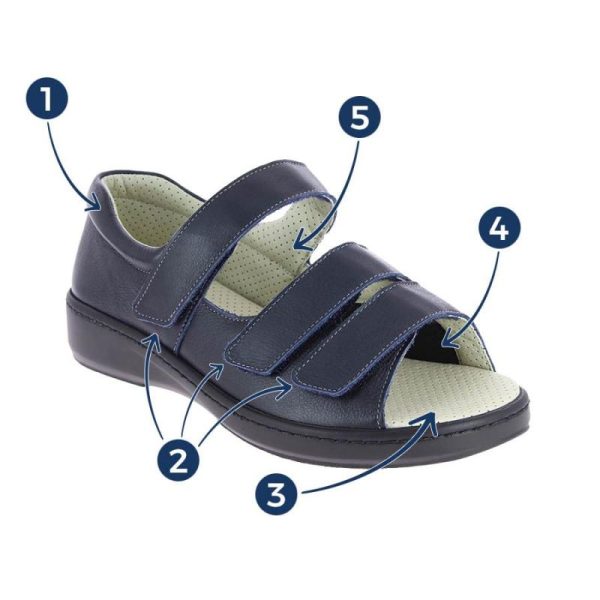 Adaptée à la reprise de la marche, et en cas d’oedème ou d’hallux valgus cette sandale en cuir maintient parfaitement le pied à l’aide de 3 brides auto-agrippantes et d’un col matelassé. Sa semelle intérieure est amovible pour être facilement lavée ou remplacée par une semelle orthopédique sur mesure.